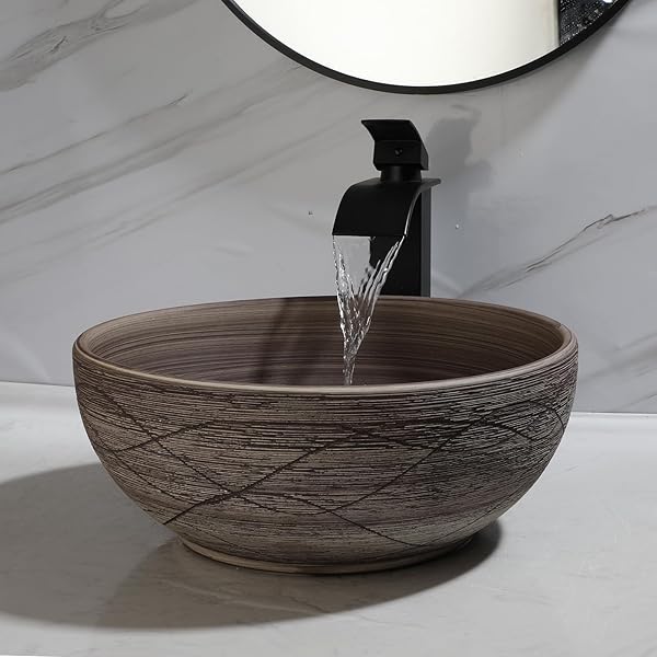 14 Inch Round Bathroom Vessel Sink with Faucet and Drain Combo Ceramic Vessel Sink Wood Bathroom Sink Above Counter Round Sinks Bowl for Bathroom