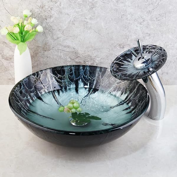 Bathroom Vessel Sink,Blcak and Green Vessel Sink,Round Glass Vessel Sink with Waterfall Faucet and Pop-Up Drain Combo,Bathroom Sink Above Counter,Modern Artistic Tempered Glass Vessel Bowl Sink