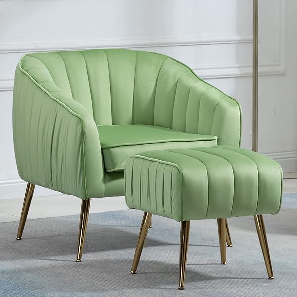 Modern Accent Chair Ottoman Barrel Arm Chair with Ottoman Set Velvet Upholstered with Solid Wood Frame & Metal Legs for Living Room, Bedroom, Reception Room (Grass Green)