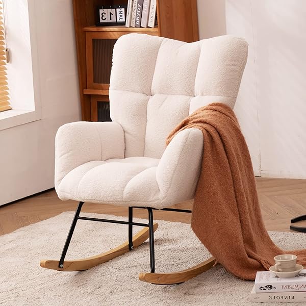 Nursery Rocking Chair Teddy Fabric Padded Seat with High Backrest and Armrest Accent Chair Upholstered Armchair Single Sofa Accent Glider Rocker for Living Room Bedroom Offices (Ivory Teddy)