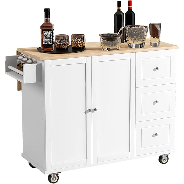Rolling Mobile Kitchen Island 52.7'' with Solid Wood Top and 2 Locking Wheels, Adjustable Shelves, Storage Cabinet and Drop Leaf, Spice Rack, Towel Rack & 3 Drawers for Kitchen (White) Drop Leaf White